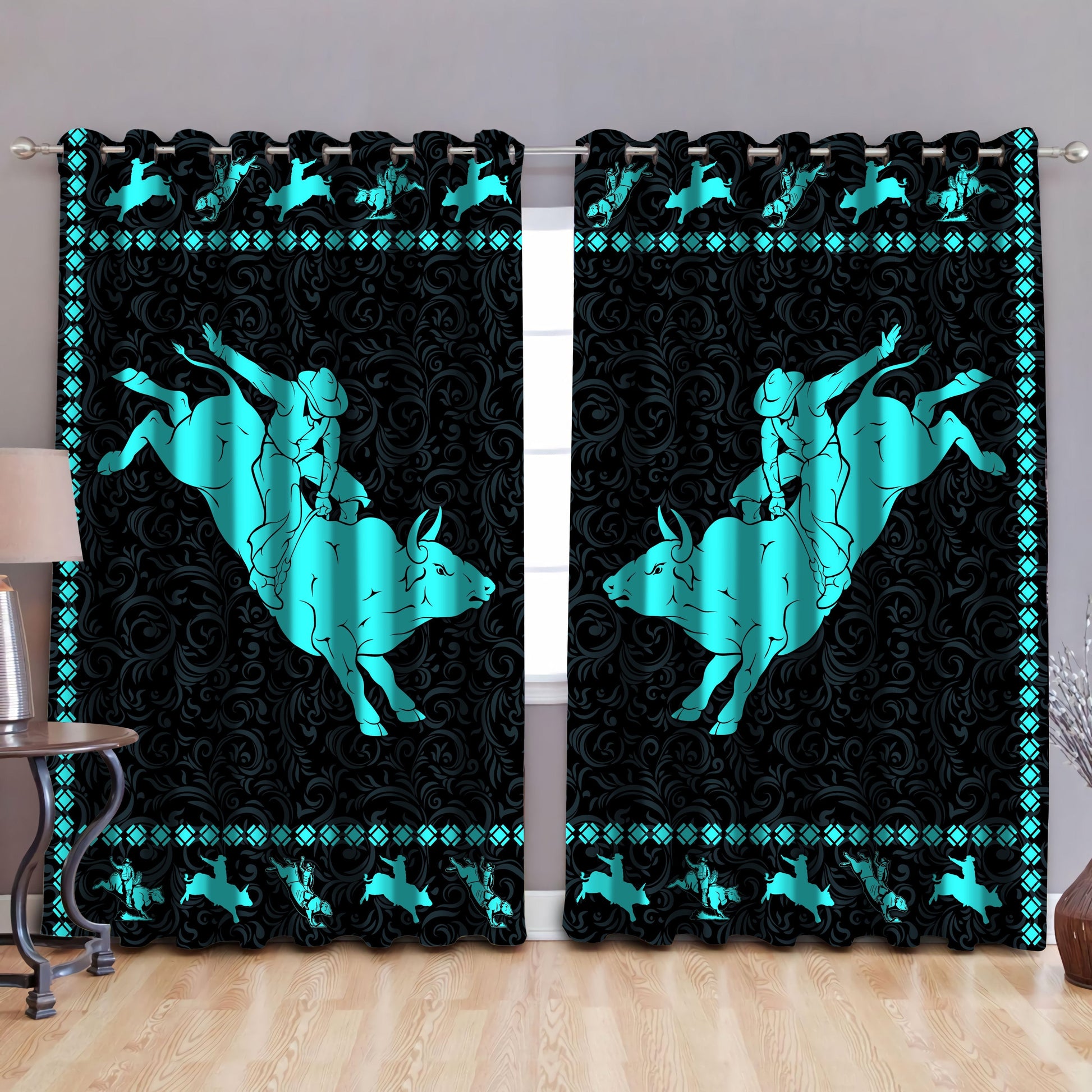 Bull Riding 3D All Over Printed Window Curtains Blue