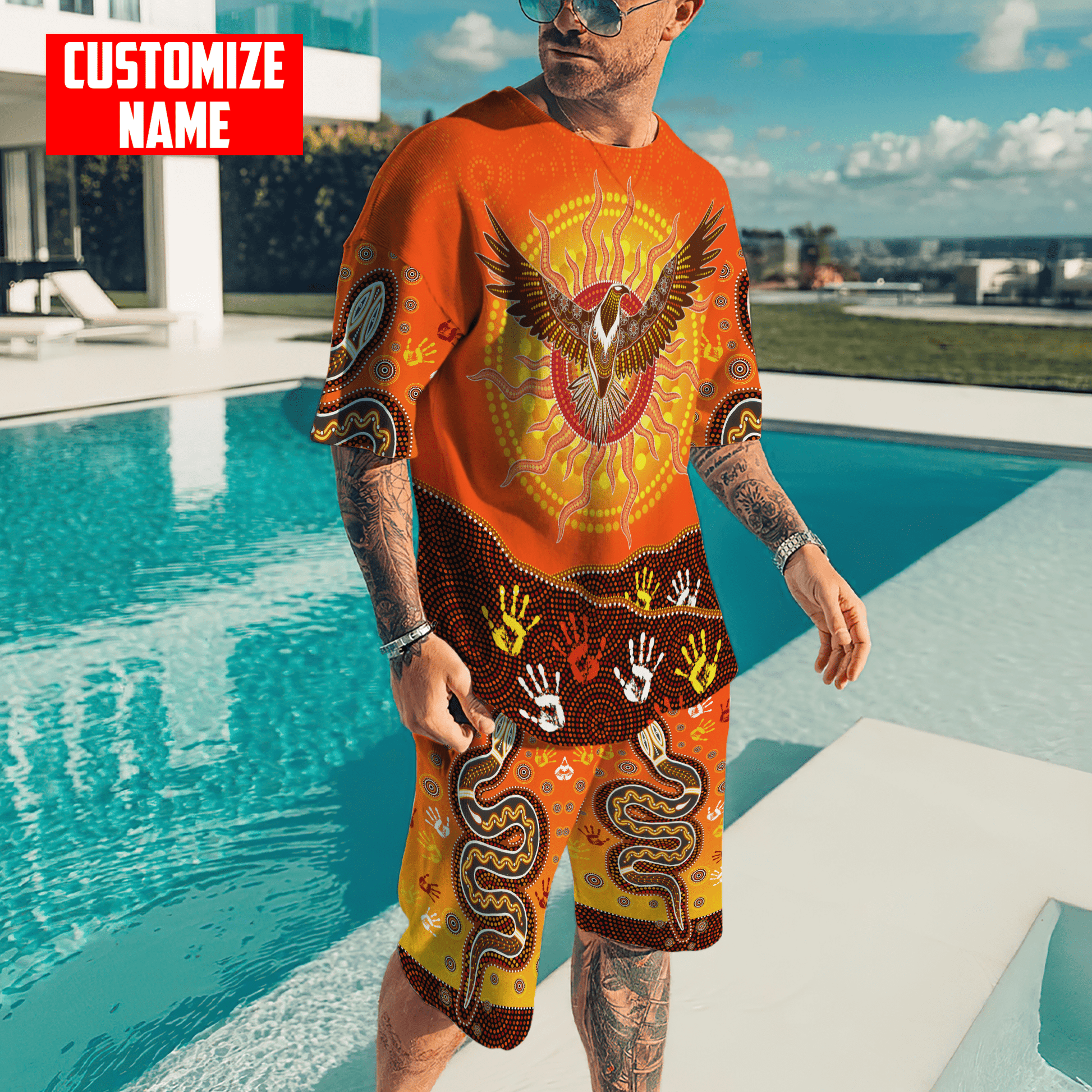 Aboriginal Eagle Flying into Sunset Custom name 3D printed combo Tshirt Board Short